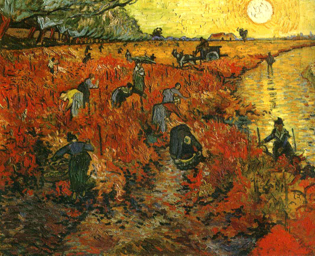 Die untergehende Sonne lässt die Rotfärbung des Weinlaubs noch intensiver zur Wirkung kommen. Zahlreiche Helfer sind im späten Herbst mit der Weinlese beschäftigt. Van Gogh malte die Szene Anfang November.