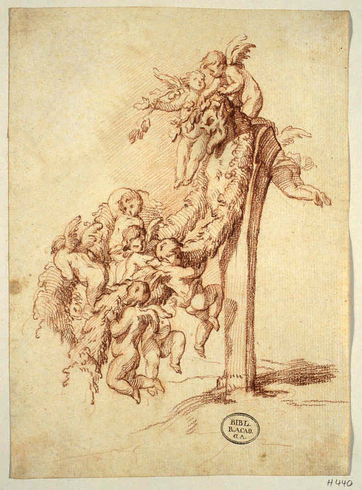 Die Herme eines Satyrn wird von Putten bekränzt