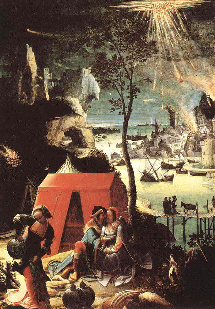 Lot floh mit seinen Töchtern in die einsamen Berge über dem Toten Meer, das an Stelle der untergegangenen Städte Sodom und Gomorrha entstanden war. Die Töchter hatten Angst, kinderlos zu bleiben. Sie gaben deshalb abends ihrem Vater Wein zu trinken und legten sich dann zu ihm, in der ersten Nacht die eine, in der zweiten Nacht die andere. Lot merkte nichts, aber beide Mädchen werden schwanger.