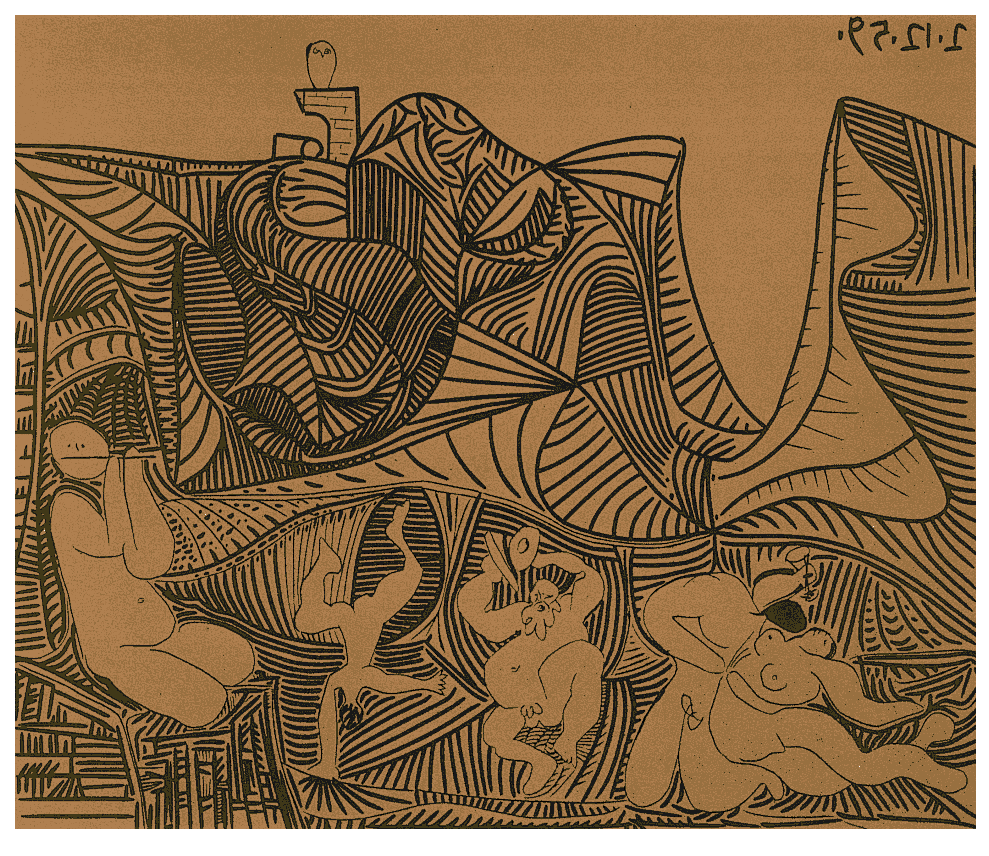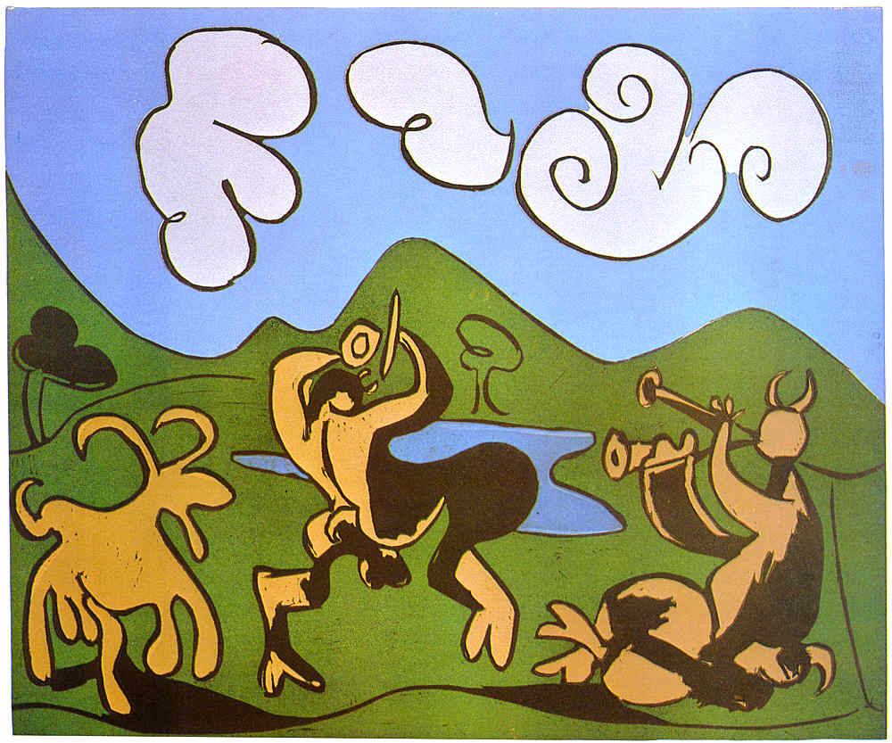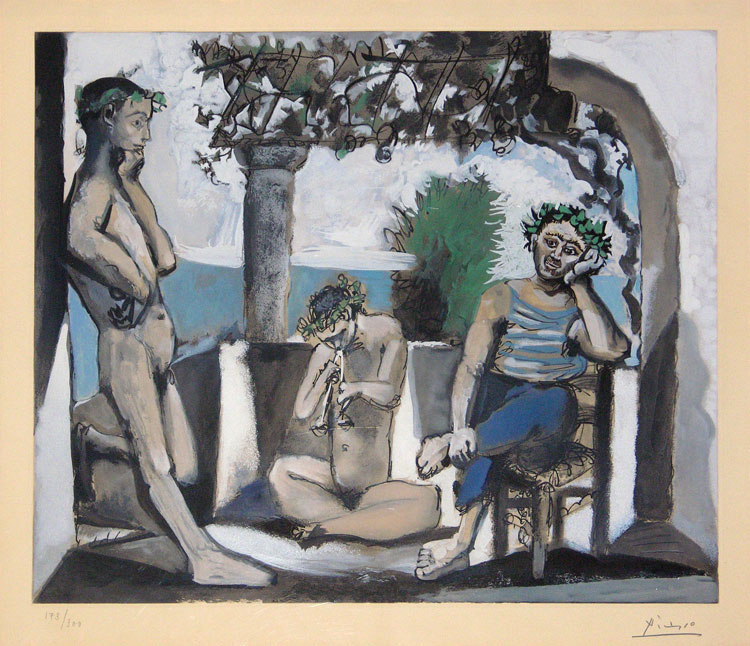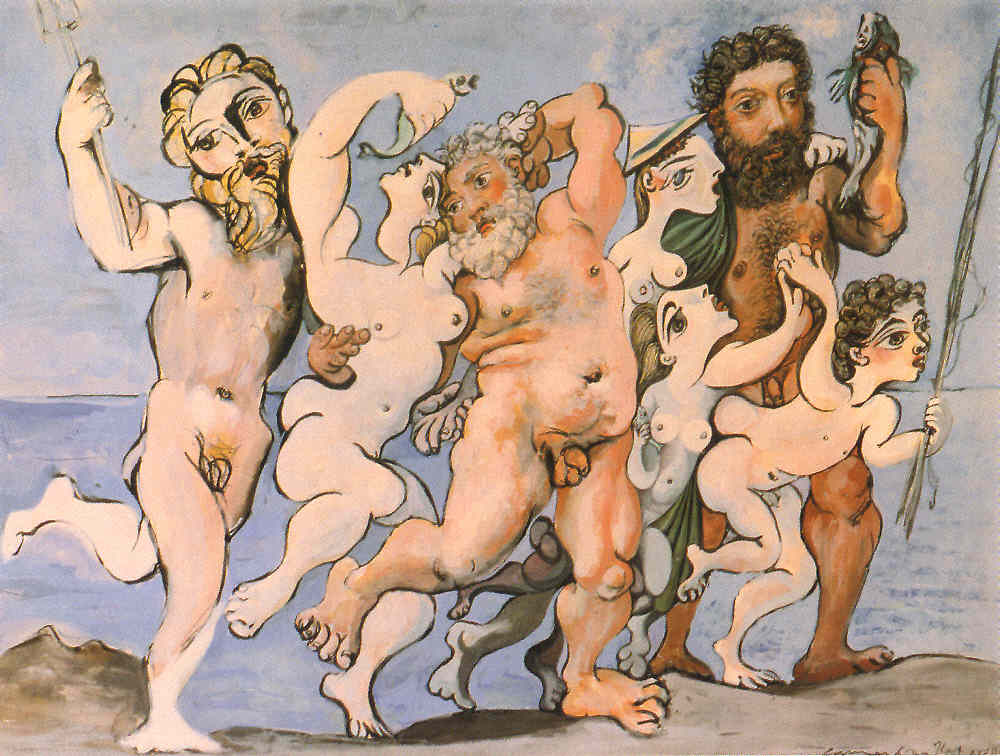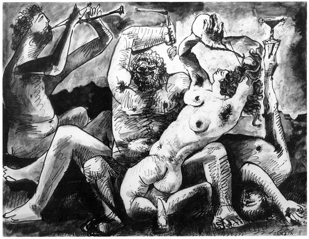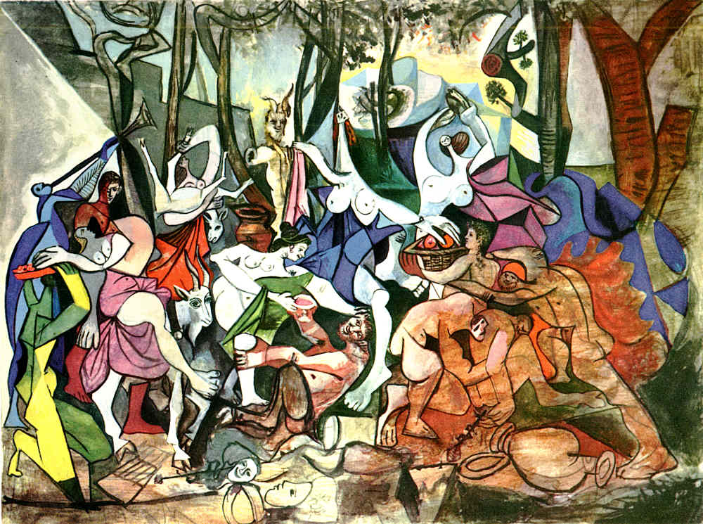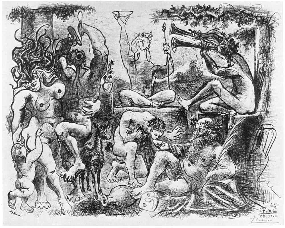 Die Vorlage von Poussin wird bei Picasso zu einer zügellosen Orgie. Die Nymphen mit ihrem Tambourin, die Faune mit ihren Flöten, das verliebte Geplänkel zwischen Satyrn in Ziegenbockgestalt und Bacchantinnen mit Stecknadel-Köpfen, die ländliche Mittelmeer-Atmosphäre, halb Tizian, halb Antike, und die heiteren Primärfarben, die wenig mit Poussin gemein haben - all dies kehrt zwei Sommer später in der Antipolis-Folge wieder.