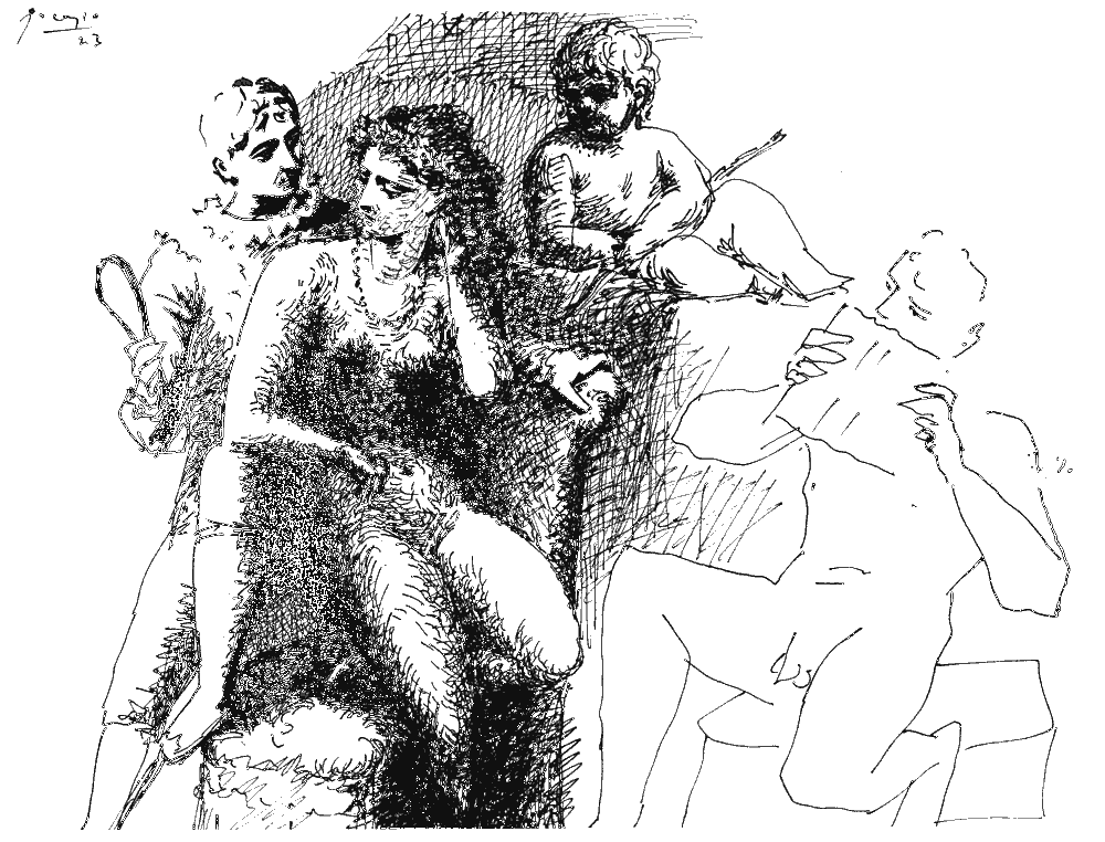 In einer den antiken Mythologien sehr frei nachempfundenen Szene versammelt Picasso einen Harlekin, einen Amor und einen Panflötenspieler um eine junge Frau. Das Motiv erinnert an traditionelle Bacchus und Ariadne Darstellungen. Etwas befremdlich macht sich hier der junge Harlekin, der den Handspiegel hält, in dem sich die Schöne betrachtet.