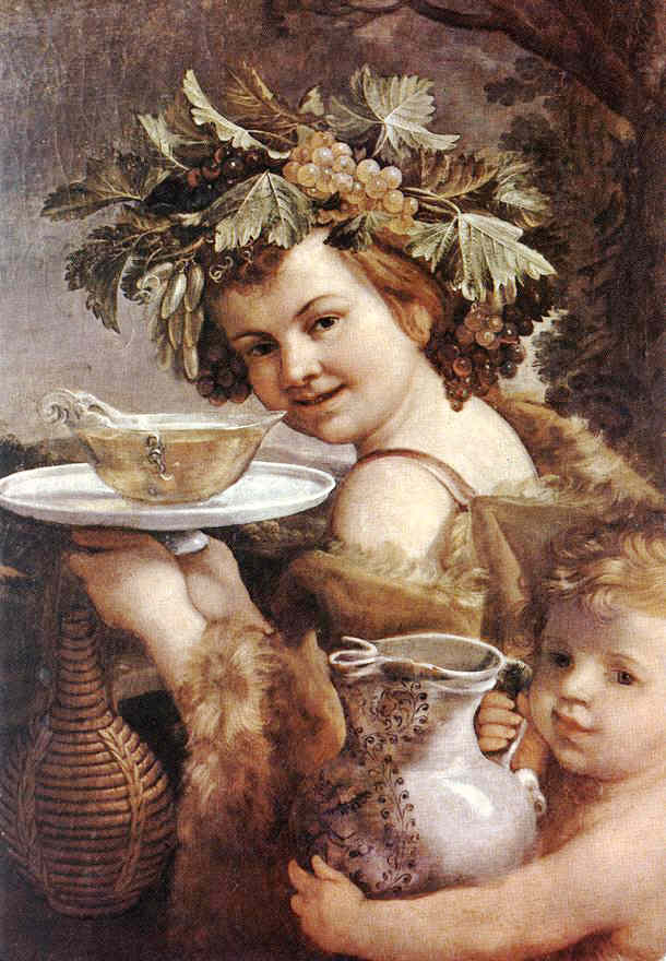 Der kindliche Bacchusknabe trinkt direkt aus einer Ballonflasche, und dabei erleichtert er sich gleichzeitig ungeniert. In Analogie ergießt sich auch aus dem Fass ein Strahl Rotwein in die Schale. Die Maßlosigkeit des weinumkränzten Gottes zeigt sich schon in früher Kindheit.