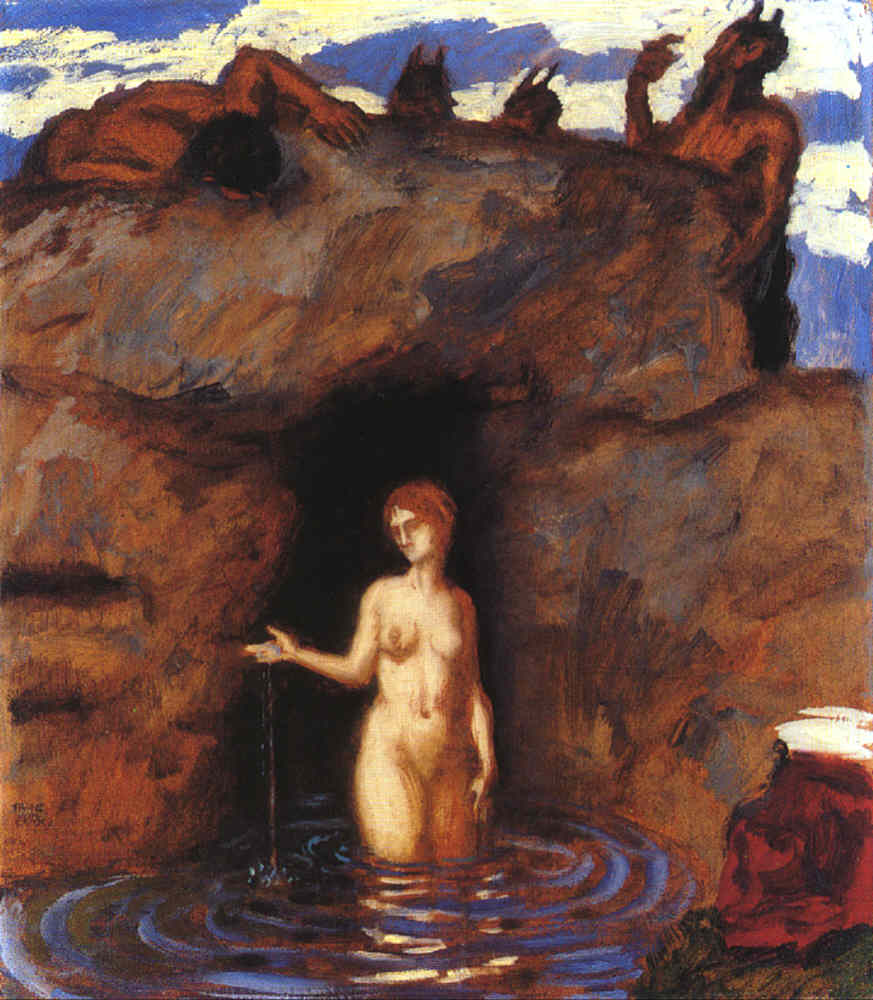 Sehr viel harmloser als in vielen früheren Gemälden sind die Satyrn des Franz von Stuck, die einer Quellnymphe beim Baden zuschauen. Vier gehörnte Wesen beäugen die Ahnungslose, aber in noch halbwegs sicherem Abstand. Um 1911 entstand diese Szene, die als Vorstudie zu einem größeren Werk angesehen wird. Harmlose Voyeure eigentlich, Darsteller im arkadischen Schauspiel, das Böcklin ebenso faszinierte wie Stuck. Aber im Zeitalter eines Sigmund Freud bedient sich der Maler differenzierter symbolischer Hinweise auf den erotischen Aspekt der Situation: Die strahlend weißhäutige Nymphe steht vor einer dunklen, feuchten Grotte, einer Felsenpforte - Sinnbild des weiblichen Schoßes.