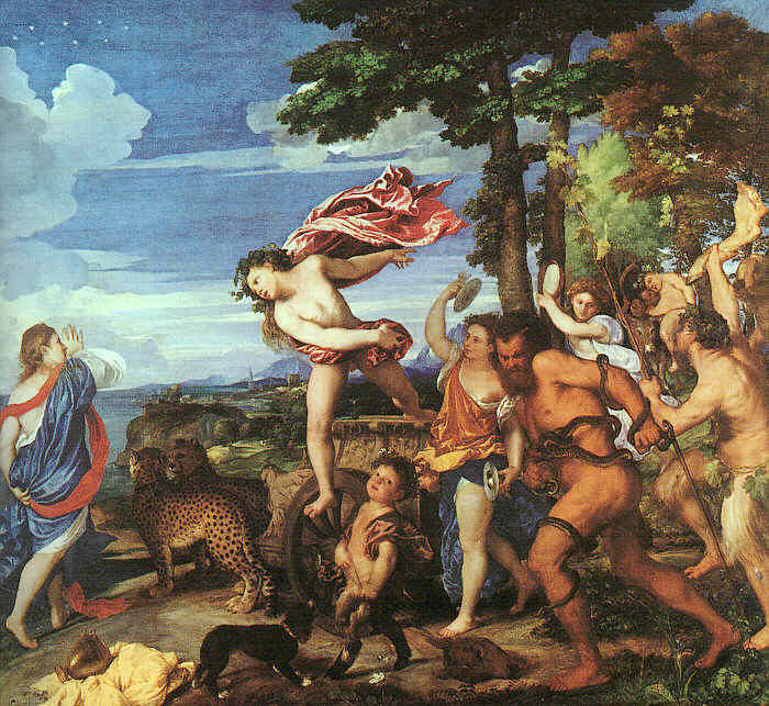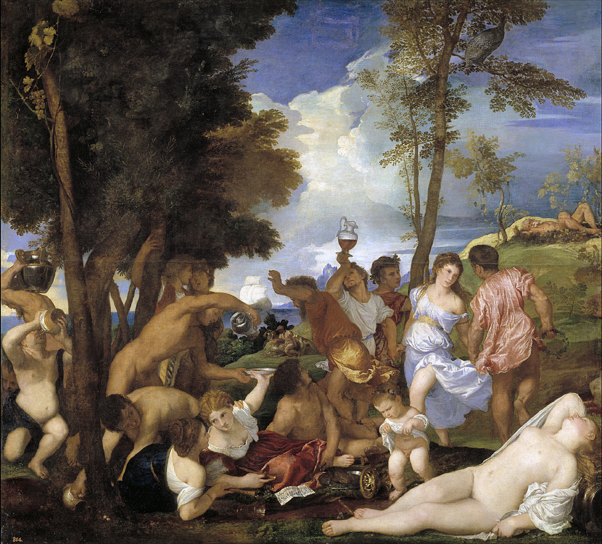 Das ausgelassene, jährlich gefeierte Bacchanal findet auf der Insel Andros statt, wo - nach dem griechischen Philosophen Philostrat - eine Quelle dank der Großherzigkeit des Bacchus reinen Wein führte und die Bewohner folglich in einem Zustand ständiger heiterer Berauschtheit lebten. Was das Bild sagen soll, schrieb Tizian auf ein Notenblatt im Vordergrund: "Wer da trinkt und trinkt nicht wieder, der weiß nicht, was trinken heißt". Damit entsprach der Maler voll und ganz der Sinnenfreude seines Gönners, Alfonso d'Este, für den er einst auf einem Bild Bellinis die Kleider so geändert hatte, dass sie mehr enthüllten.