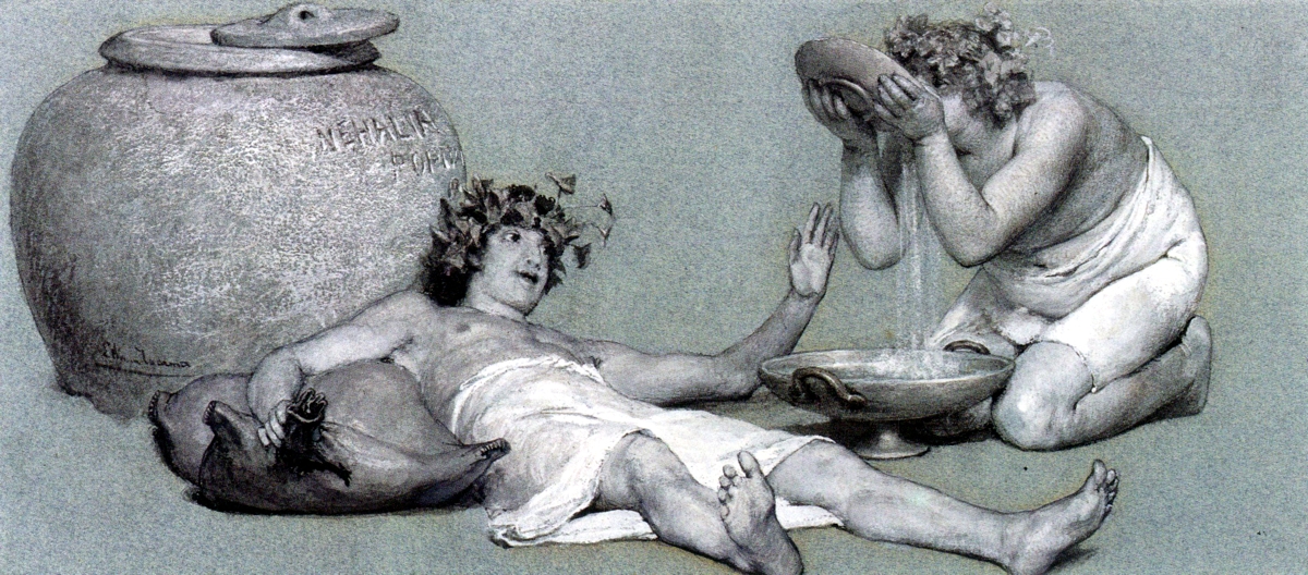 Nach einem ekstatischen Fest erwachen die zum Teil noch auf dem Marmorboden vor einem Tempel liegenden Bacchantinnen und sehen sich umringt von den hilfreichen Frauen der Stadt Amphissa, die ihr Erwachen interessiert und aus respektvoller Distanz verfolgen, ihnen im Einzelfall vorsichtig auf die Beine helfen.