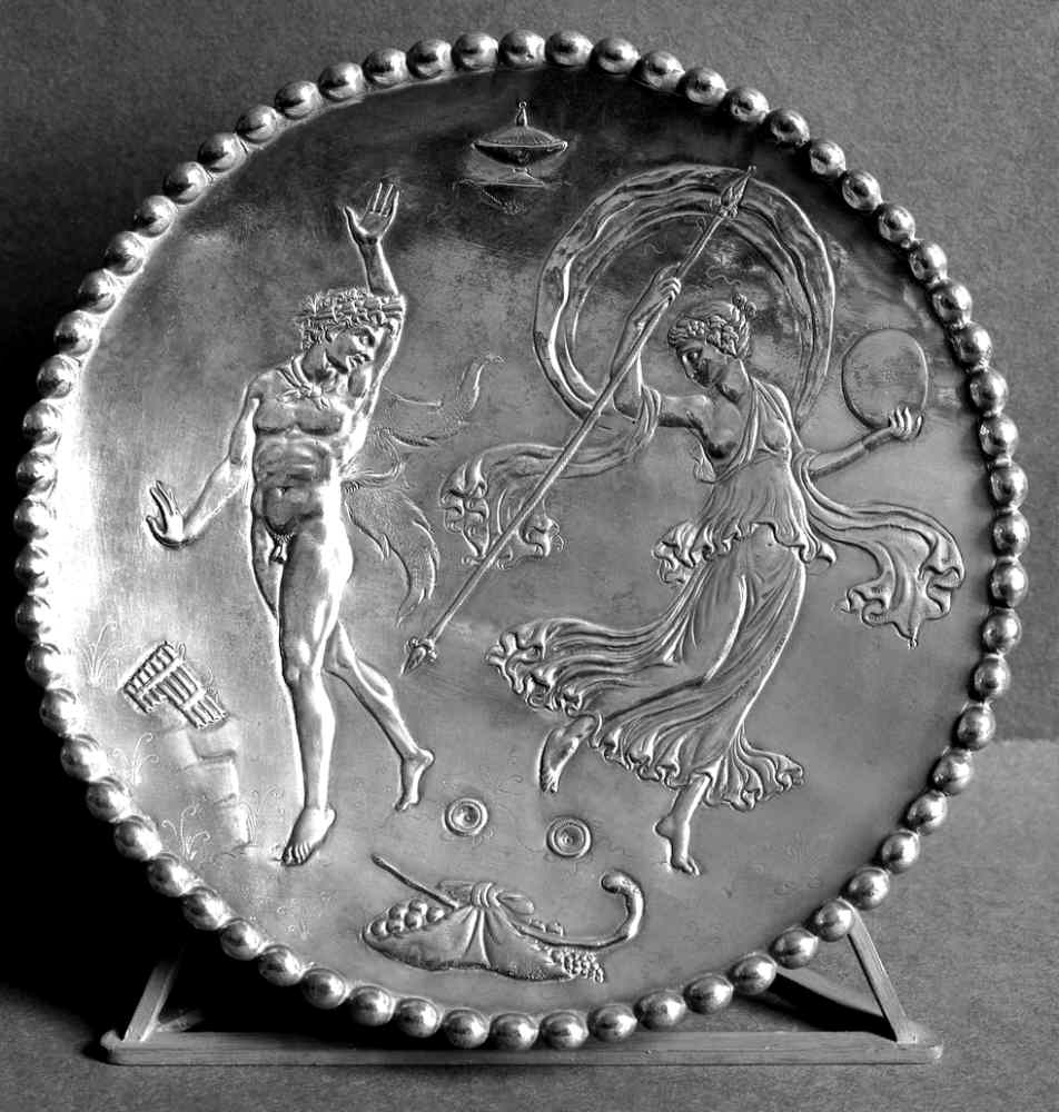 Silberne Platte aus dem Mildenhall-Schatz mit Mänade und Pan